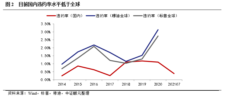 為了更好地了解我國債券違約率水平,我們將國內違約率與全球違約率水平進行了對比。數據顯示,盡管近年來我國違約率整體呈增長趨勢,但相較于穆迪全球和標普全球來講,我國違約率水平仍然較低(圖2),近年全球違約率平均值在2%上下。