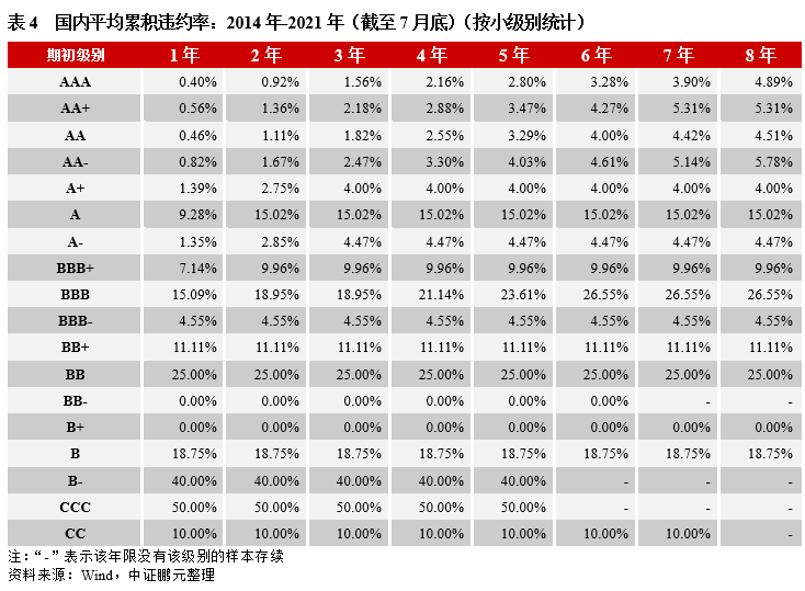 2.相比穆迪全球,我國高級別累積違約率水平整體偏高。例如AAA級,國內AAA級8年累積違約率為4.89%,穆迪全球僅為0.13%。