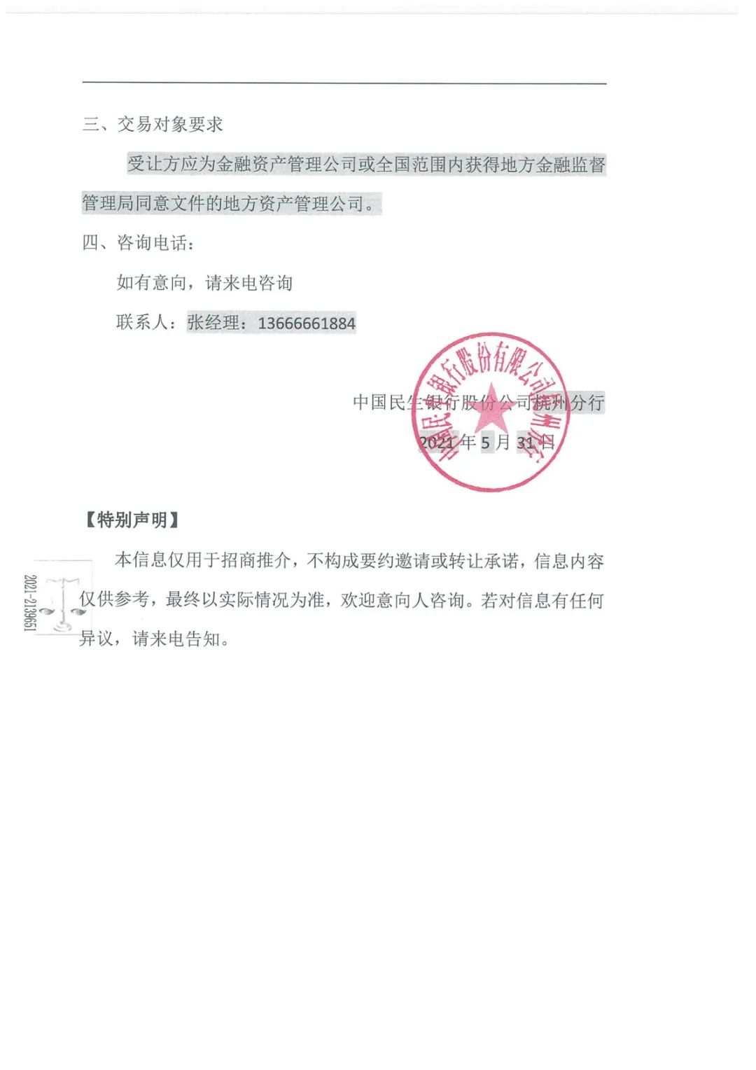 民生銀行杭州分行希望受讓方為金融資產管理公司或全國范圍內獲得地方金融監督管理局同意文件的地方資產管理公司。