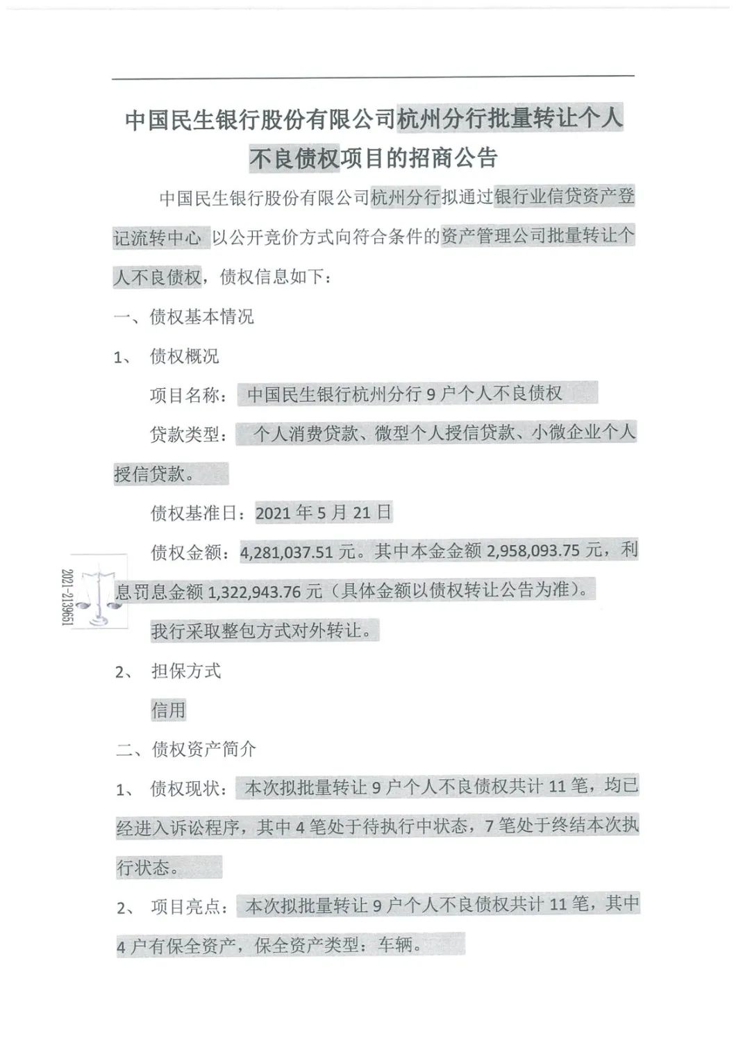 6月3日,銀登網披露一則《民生銀行杭州分行批量轉讓個人不良債權項目的招商公告》(簡稱:《公告》)。