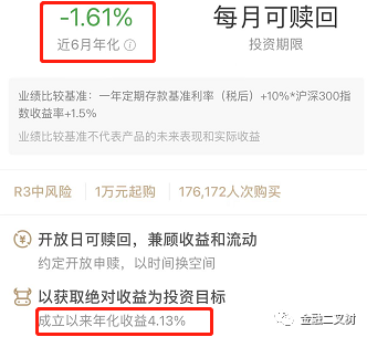 現(xiàn)金管理類產(chǎn)品的業(yè)績(jī)展示,例如:平均7日年化,沒什么好說(shuō)的,問題不大,平均在2%到3%左右,對(duì)于其他的產(chǎn)品例如銀行理財(cái)、券商資管計(jì)劃、私募基金,就要擦亮眼睛了。這里面可大有文章,有的產(chǎn)品明明展示的歷史業(yè)績(jī)很高,可自己的產(chǎn)品確實(shí)虧的,因?yàn)槭紫裙芾砣苏故境鰜?lái)的業(yè)績(jī)肯定是這個(gè)產(chǎn)品閃光的部分,再一個(gè)就是這畢竟是歷史業(yè)績(jī),僅代表過(guò)去產(chǎn)品的收益情況而不代表未來(lái)。比如下面這個(gè)產(chǎn)品: