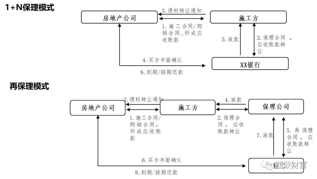 銀行的房地產保理業務一般是施工企業/材料供應商為房地產開發商提供施工/貨物服務形成應收賬款后,將對房地產開發商的合格應收賬款轉讓給銀行,由銀行為施工企業提供集應收賬款催收、管理、壞賬擔保及保理融資于一體的綜合性金融服務。業務模式可分為1+N保理模式和再保理模式。