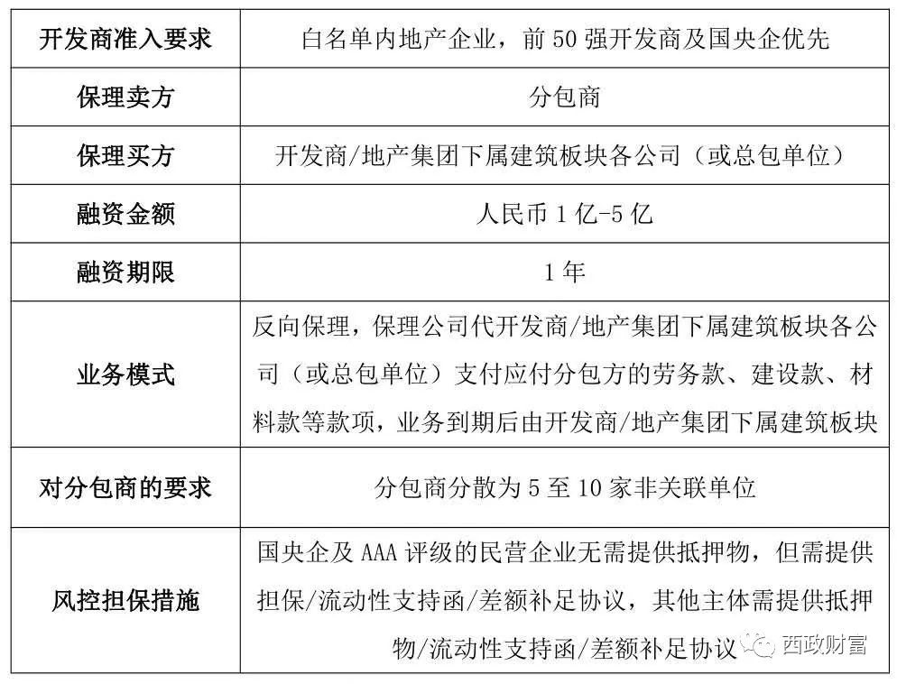 我們目前操作的分包單位反向保理融資主要是保理公司白名單內的開發商下屬建筑板塊各公司或其他總包單位支付應付分包方的勞務款、建設款、材料款等款項,并在業務到期后由開發商下屬建筑板塊各公司或其他總包單位支付保理公司保理款項的業務操作模式。因上述分包單位的應收賬款主要針對開發商的關聯方(開發商下屬建筑板塊各公司或其他總包單位),因此分包單位反向保理融資主要還是依托于開發商的主體和征信,在風控擔保措施上開發商的擔保、流動性支持函、差額補足協議或其項目公司提供的抵押物就變得必不可少。