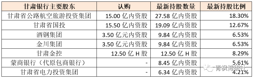 經過此次改革重組后,甘肅省公路航空旅游投資集團、甘肅省國投、酒鋼集團、金川集團、甘肅金控以及甘肅省電力投資集團合計持有甘肅銀行的股權比例達到56.53%,蒙商銀行的持股比例則由之前的8.39%降至目前的5.61%、由第二大股東降至第六大股東。