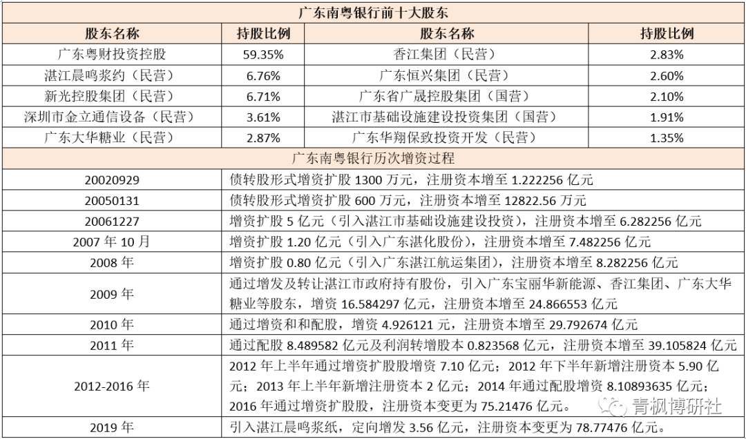 (三)廣東南粵銀行:原三家股東陷危機,引進第一大股東粵財投資控股 1、2021年12月27日,廣東銀保監局核準了南粵銀行的增資擴股方案(增發115億股股份);同年12月31日,廣東銀保監局同意南粵銀行注冊資本金由78.77476009億元增至193.77476009億元(即新增115億元)。此次增發的115億股股份,全部由廣東粵財投資控股認購,認購后廣東粵財投資控股持有廣東南粵銀行總股本的59.35%,成為后者第一大股東。