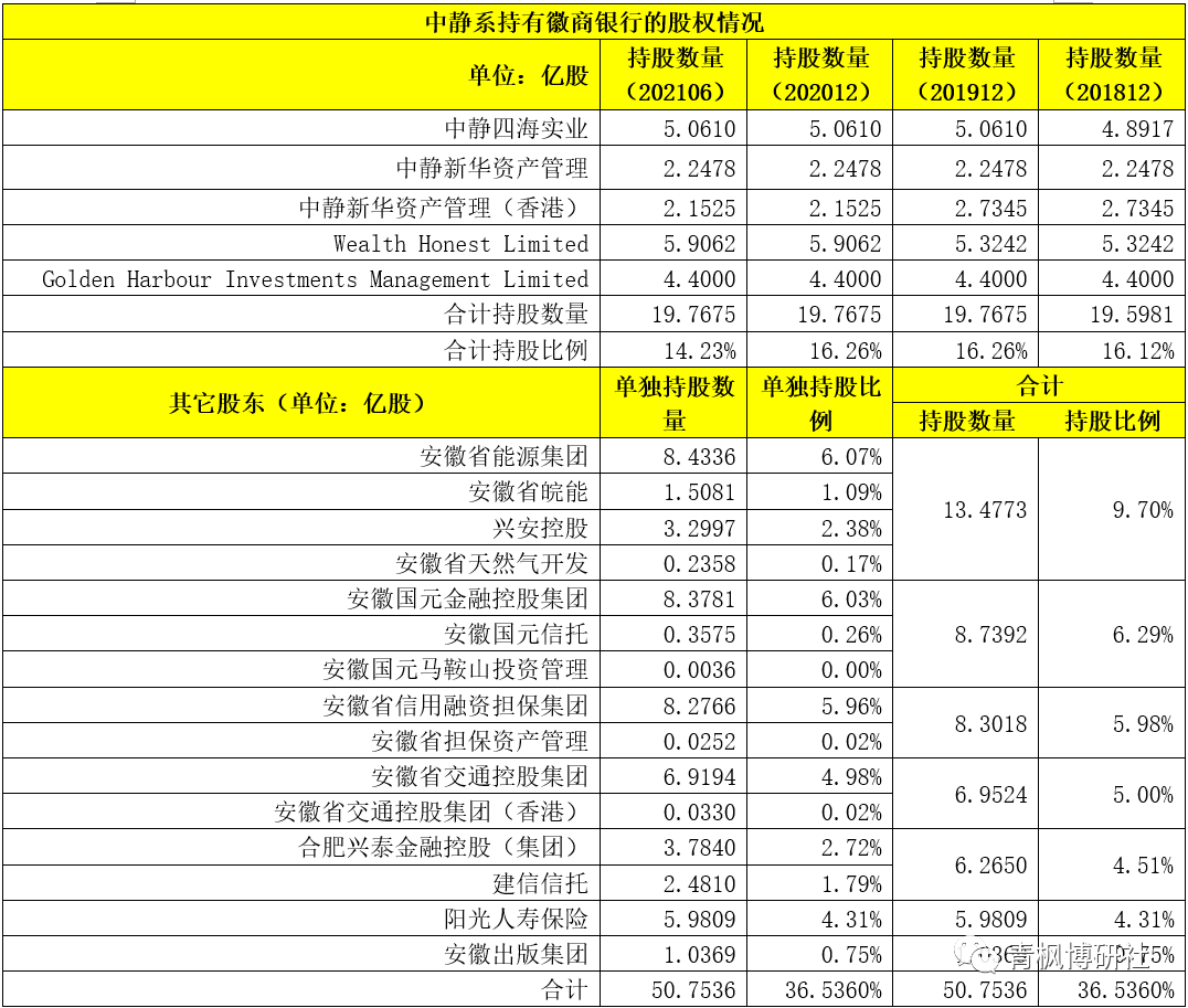 2、中靜系主要通過旗下中靜新華資產管理、中靜新華資產管理(香港)、中靜四海實業以及Wealth Honest Limited、Golden Harbor Investments Management Limited等主體持有徽商銀行股份。截至2021年6月,中靜系合計持有徽商銀行19.7675億股股份,持股比例達到14.23%,為徽商銀行第一大股東。