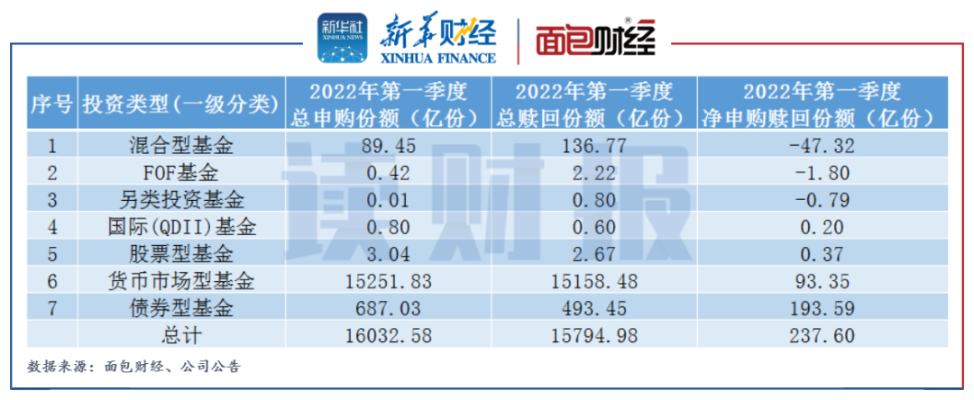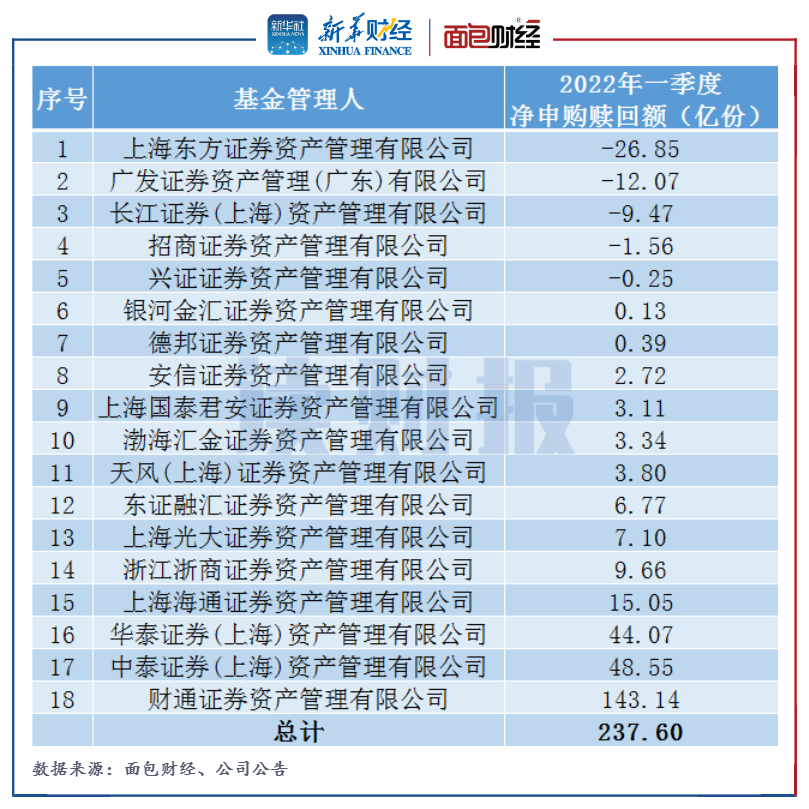 面包財(cái)經(jīng)和新華財(cái)經(jīng)對(duì)18家券商資管子公司旗下產(chǎn)品一季報(bào)的統(tǒng)計(jì)發(fā)現(xiàn),2022年一季度,由券商資管子公司管理的500余只開放式公募基金產(chǎn)品份額凈申購合計(jì)237.6億份,其中總申購16032.58億份,總贖回15794.98億份。