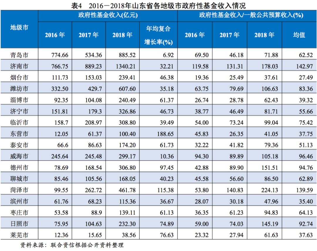 從政府性基金收入來看,山東省各地級市收入分化較重,其中濟南市的收入規模最大,2018年達1340.21億元,遠超其他地級市,其次為青島市和濰坊市,2018年分別為885.52億元和607.60億元,其余地級市政府性基金收入規模均在500億元以下,其中萊蕪市規模最小,2018年為38.56億元。從政府性基金收入增速來看,東營市和菏澤市的增速最大,近三年的年均復合增長率分別為188.65%和115.38%,青島市增速最小,近三年復合增長僅為6.92%。從政府性基金收入占一般公共預算收入的比重均值來看,濟南市和菏澤市占比均超過100%,且上述兩個地級市過往三年的政府性基金收入占當年一般公共預算收入的比重持續增長,政府財力對基金預算收入的依賴性逐步增強;淄博市、萊蕪市、濱州市、東營市和煙臺市的比重均值較小,處于40%以下;其余大部分地級市的比重均值處于50%~95%之間??傮w看,山東省部分地級市政府財政收入對政府性基金收入的依賴性較高,當地財政收入的實現性易受房地產市場景氣度以及土地出讓進度的影響。