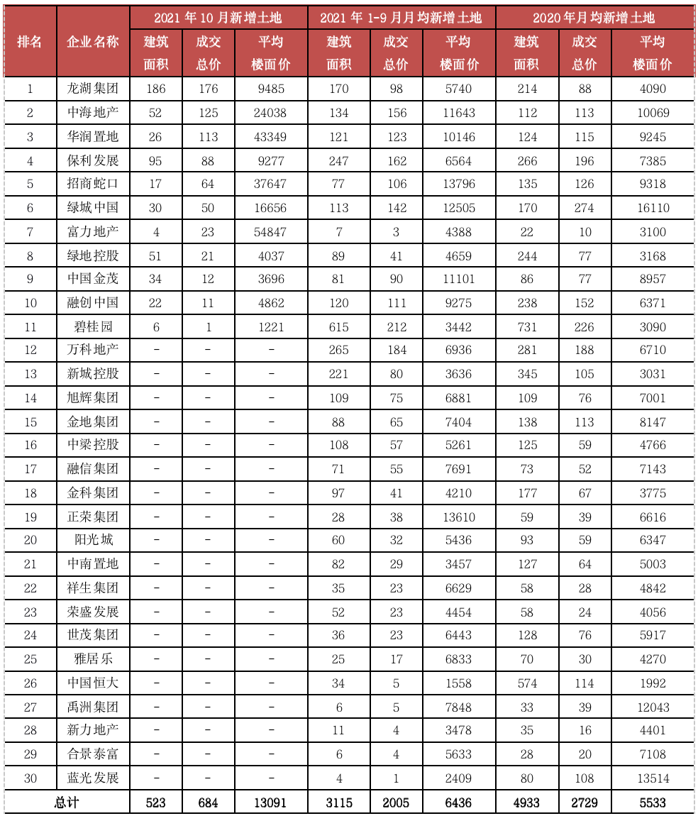 表:2021年10月30家監測企業新增土地統計表(單位:萬平方米、億元、元/平方米)