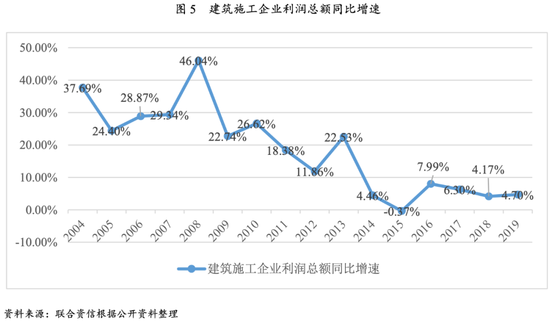 受固定資產投資下行壓力影響,2015年以來建筑業總產值增速低位波動,建筑業增加值增速整體呈現下滑趨勢。在行業整體收縮的狀態下,建筑施工企業競爭進一步加劇,利潤總額增速降幅明顯。