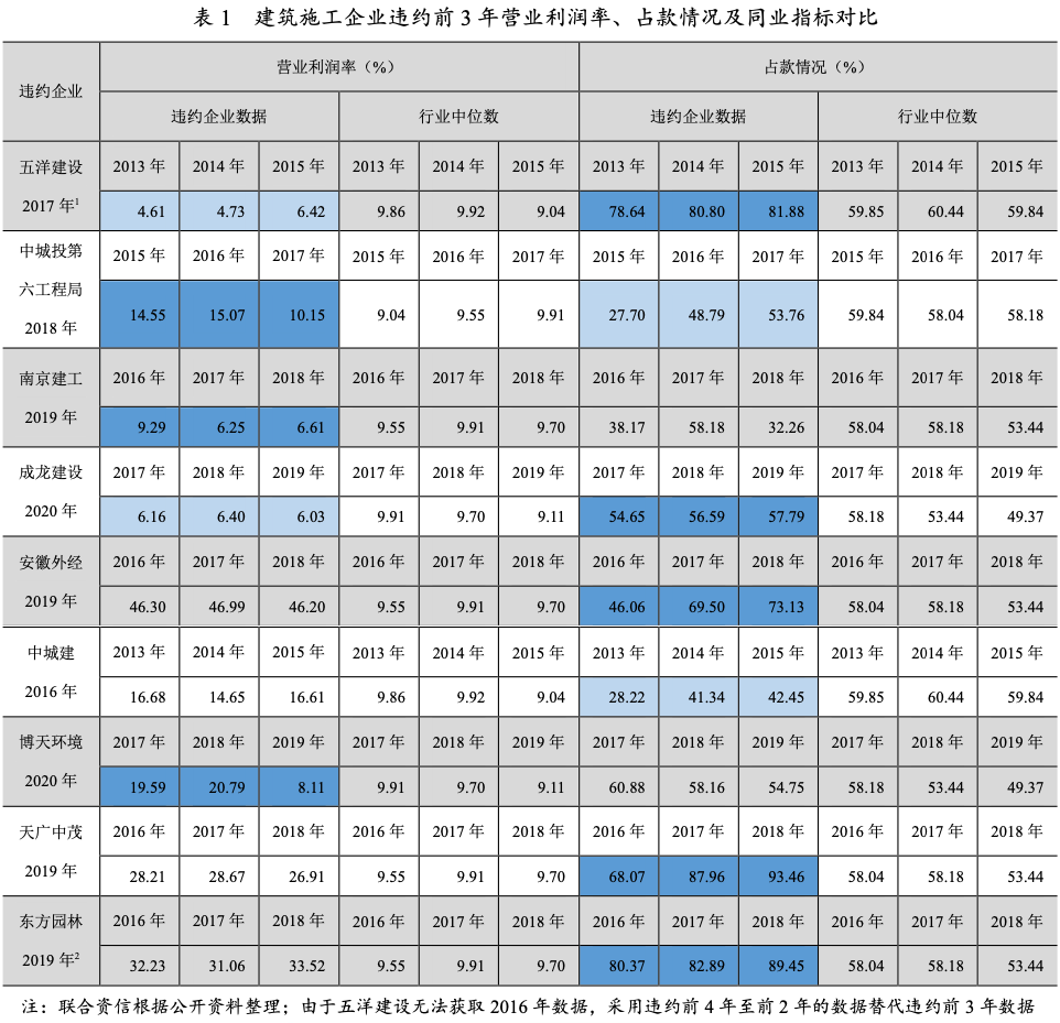 首支公開發行公司類信用債違約以來,信用債違約規模和支數近年來呈現快速增長態勢。從違約行業分布來看,違約債券余額較高的行業以周期性、過剩產能行業為主,兼具高負債水平等行業特點。建筑施工行業具備周期性強、行業準入門檻低、杠桿水平高等特點,在企業去杠桿、金融嚴監管背景下,建筑施工企業信用風險迅速累積,最終導致違約事件發生。本文從評級視角下,通過研究近年來違約和部分級別下調的建筑施工企業,對其經營管理和財務管控等方面進行分析,探尋并總結這類企業在流動性趨緊及市場需求增速放緩等外部環境影響下表現出來的共性特征,為未來判斷企業風險提供參考。通過分析發現,建筑施工違約企業產業鏈地位較低,具體表現包括:下游占款情況較為嚴重、回款效率較低;在違約前3年內往往表現出盈利能力下滑、債務水平整體偏高、短期償債指標表現明顯低于行業中位數等特征。