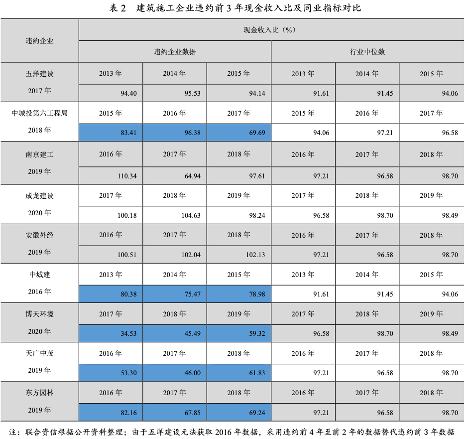 ③現金收入比。本文用銷售商品接受勞務收到的現金/營業收入反映企業的業務回款質量。2013年以來,建筑施工企業的現金收入比呈現小幅上升的趨勢。9家違約企業中,有5家違約前3年現金收入比均有所下降或遠低于行業中位數。