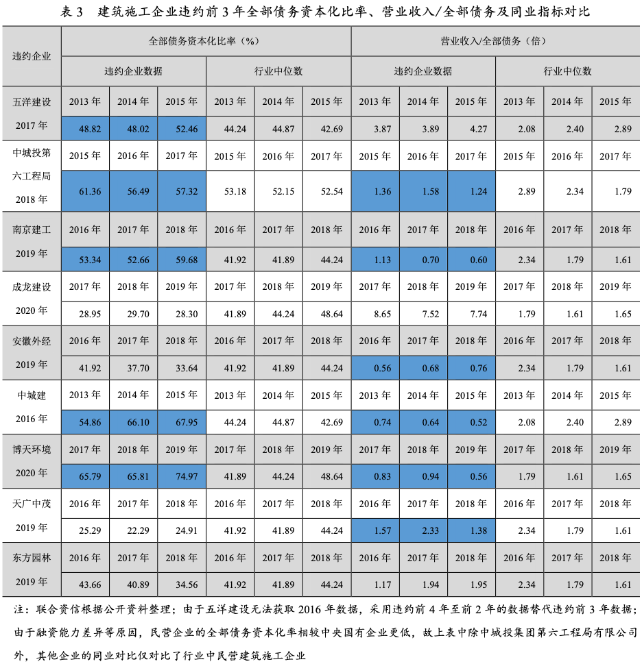 ①債務負擔。本文選取了全部債務資本化比率反映企業的債務負擔。由于建筑施工項目通常涉及的建造成本高,資金需求量大,而在激烈的市場競爭中,建筑施工企業通常需要在施工的各個環節墊付資金,而工程款一般回款較慢,導致建筑施工企業全部債務資本化率普遍較高。2013年以來,建筑施工企業的全部債務資本化比率中位數均在50%以上。其中,民營建筑施工企業由于融資能力和資金統籌能力的問題,通常債務水平較中央國有企業更低。9家違約企業中,除中城投集團第六工程局有限公司(以下簡稱“中城投第六工程局”)外,其余都是民營企業,有4家民營企業的全部債務資本化比率明顯遠高于民營建筑施工企業的中位數,而中城投第六工程局的該指標也高于全行業中位數。