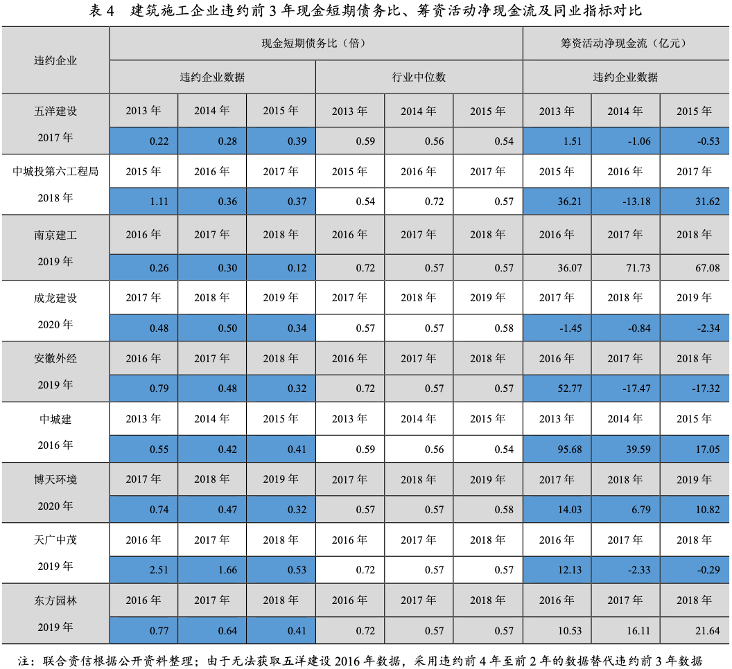 ②籌資活動凈現金流。一般來說,當一家企業籌資活動凈現金流逐漸減少甚至由正轉負,或融資成本明顯高于同行業可比公司時,敏感的金融機構(尤其是對企業情況熟悉的當地銀行機構)會有所警惕,并采取積極的措施以降低其風險,而該行為很有可能會傳導至更多的債權人。對于嚴重依賴于短債滾存的建筑施工企業,融資渠道脆弱,受到沖擊的可能性更大。9家違約企業中,有7家均在違約前3年出現了籌資活動凈現金流下降的現象,其中3家大幅下降,安徽外經甚至從大幅凈流入轉為大額凈流出,且這三家企業違約前3年,整個行業中呈現籌資性活動現金凈流出的企業并不占多數。