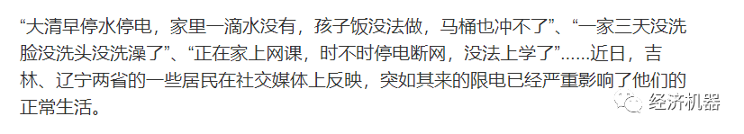 出現(xiàn)因排氣扇停擺而煤氣中毒、孕婦被迫爬二十幾層樓的、甚至有企業(yè)因限電而出現(xiàn)煤氣泄漏和中毒的狀況。情況之嚴(yán)重,超出常識(shí)的范疇了。
