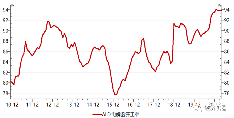 過(guò)去數(shù)年,去產(chǎn)能成為供給側(cè)結(jié)構(gòu)性改革的重心和抓手。工業(yè)主管部門(mén)確定了在鋼鐵、煤炭、水泥、電解鋁、玻璃等幾大產(chǎn)能過(guò)剩重點(diǎn)行業(yè),以壯士斷腕的勇氣,給出每年壓縮產(chǎn)能的具體任務(wù)和指標(biāo)。經(jīng)過(guò)數(shù)年努力,我國(guó)鋼鐵行業(yè)壓縮產(chǎn)能累計(jì)達(dá)到1.5億噸,煤炭行業(yè)退出落后產(chǎn)能超過(guò)10億噸,電解鋁落后產(chǎn)能淘汰近500萬(wàn)噸,超額完成“十三五”任務(wù),絕大部分產(chǎn)能過(guò)剩行業(yè)“過(guò)?!睜顩r得到實(shí)質(zhì)性改善,部分大宗商品供過(guò)于求的狀況得到根本緩解,基本處于供求平衡的狀態(tài),如煤炭行業(yè)產(chǎn)能利用率接近100%(圖1),電解鋁行業(yè)產(chǎn)能利用率從2016年1月份最低時(shí)77.8%,上升到當(dāng)前的94%(圖2)。疫情前去產(chǎn)能工作取得了實(shí)質(zhì)性的勝利,歷史任務(wù)已經(jīng)基本完成。