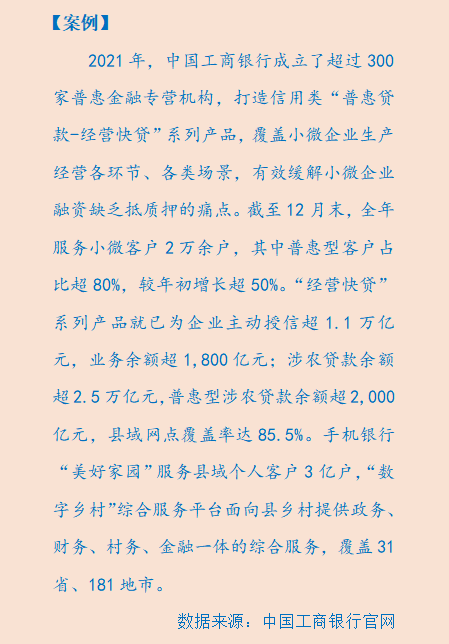 2021年,中國工商銀行、中國建設銀行、中國農業銀行、中國銀行、交通銀行和中國郵儲銀行均超額完成了“小微企業貸款增長30%”目標,各自下沉分支機構,向偏遠地區和農村地區拓展物理服務網絡,打造多層次、廣覆蓋、商業化普惠金融服務體系,一定程度上解決了貧困地域偏遠、貧窮農戶分散、物理網點不足問題。