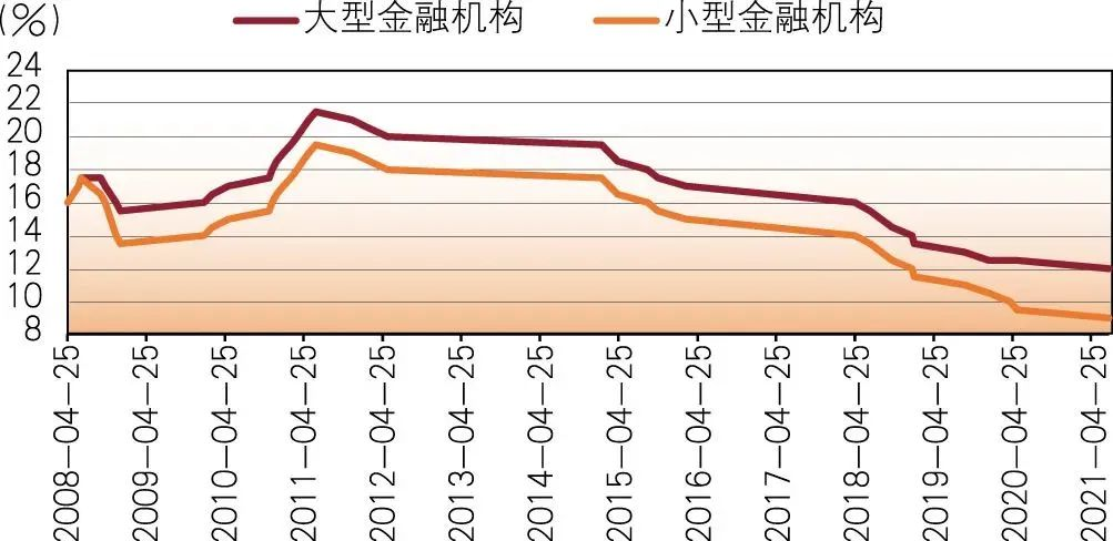 2021年,中國人民銀行加大了信貸結構優化力度,利用定向降準實現金融服務普惠性。其中,中小金融機構法定存款準備金比率已經降至了9%,相較于之前19%的高點,下降了10個百分點,較大型金融機構低了3個百分點,為中小微企業、“三農機構”、個體工商戶創造了良好的流動性環境。