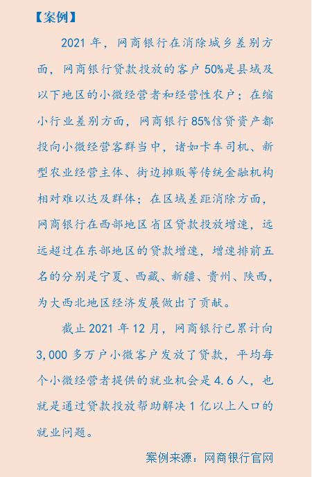 2021年,互聯網銀行通過大數據和互聯網技術,利用遠程信息收集、網上申請、網上審核和線上投放資金服務,一定程度上解決抵押擔保缺乏、經營風險成本高昂、資金投放粗放問題,讓地處偏遠地區的小微企業、個體工商戶也能夠享受到有溫度的網絡金融服務。