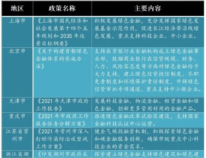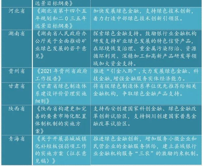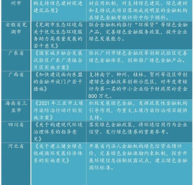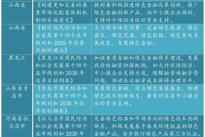 從2021年開始,我國部分省市出臺一些列政策推動綠色金融產業的發展,圍繞鄉村振興、精準扶貧、三農雙創等方面開展金融產品和服務方式創新,將綠色金融理念與標準延伸至小微企業貸款、涉農貸款、返貧致貧、雙創貸款等普惠金融業務,逐漸將“協調、綠色、共享”理念在普惠金融中落實,滿足不同群體的差異化需求。
