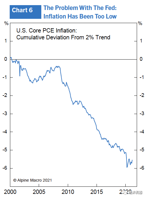(2) 當時制造業幾乎占美國經濟的四分之一;現在僅為10%。當前,世界正進入由技術提供方和使用方共同主導的“第四次工業革命”,一場完美的技術創新風暴正在形成,并將在未來幾年加速。世界經濟的快速數字化、機器人技術、人工智能和5G通信本質上是導向通縮的,這在很大程度上解釋了美聯儲為什么十多年來未能將通脹率提高到目標水平的原因(圖6)。