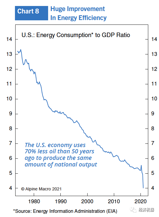 隨著美國經濟石油需求密集度的急劇下降(圖8),不可能出現上世紀70年代那樣的重大石油沖擊。如果非要說有什么影響的話,隨著經濟的脫碳進程和科技不斷降低綠色替能源的成本,油價可能會承受更大的通縮壓力。任何綠色能源的狂熱都意味著該行業獲得資本的途徑似乎是無限的,這業必將增加替代能源的供應。