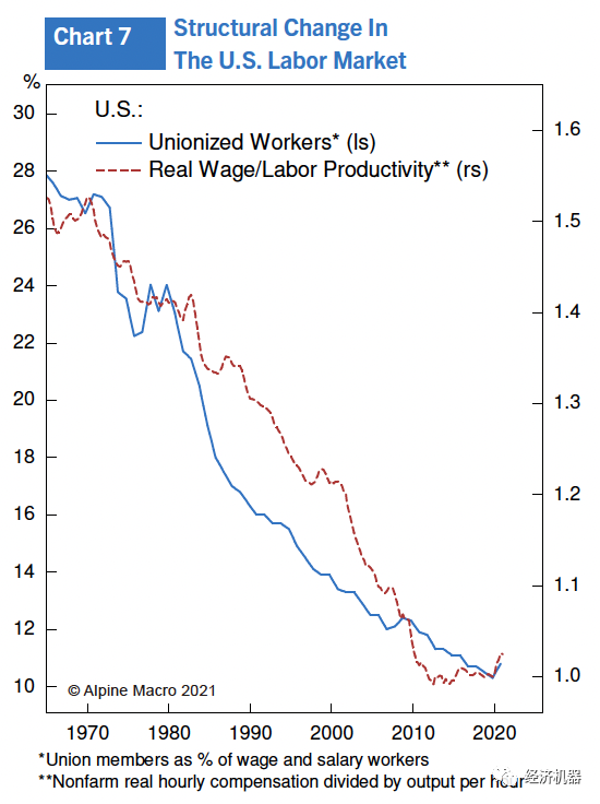 (3) 當時加入工會的工人數量占勞動力的25%,現在約占10%。工會引入剛性工資,同時降低勞動生產率(圖7)。在70年代和80年代,剛性工資是導致勞動力價格螺旋上升的一個關鍵原因。今天,美國的大多數工人不僅要相互競爭工作,而且由于全球化的影響,還必須直接或間接地與低工資國家的工人競爭。平均工資率很難持續超過勞動生產率的水平。