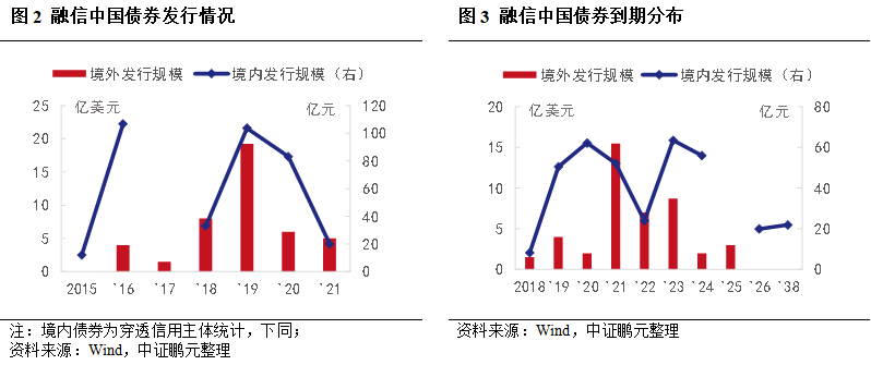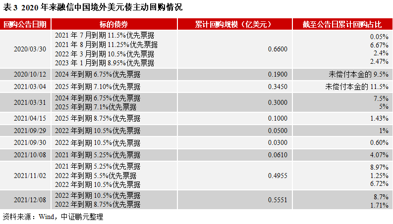 2020年來,融信中國累計多次主動回購存續美元債,調整負債結構,增強市場信心,且多在債券到期日之前進行。2021年共發行11億美元債券,回購約1.24億美元,其中2021年和2022年到期的約0.49億美元。