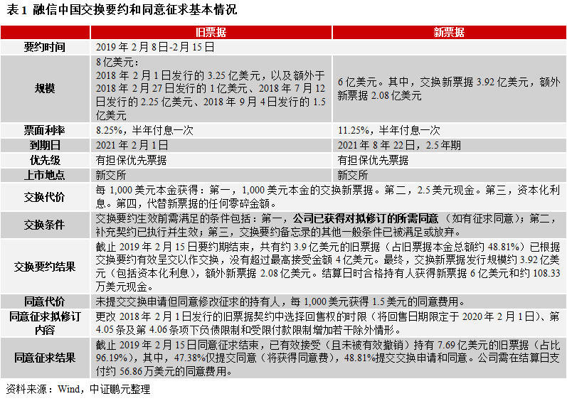 2019年2月8日公告,公司對4只2021年到期的8.25%優先票據中未償付的部分采用“交換要約+同意征求”方式進行負債管理,同時面向合格持有人發行額外新票據,來滿足延長現有債務期限,和對1年內到期中長期債務進行再融資的需求。具體內容見下表。