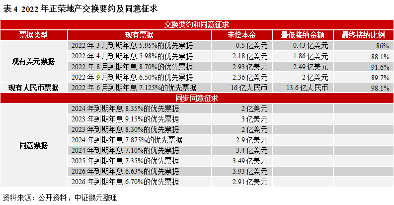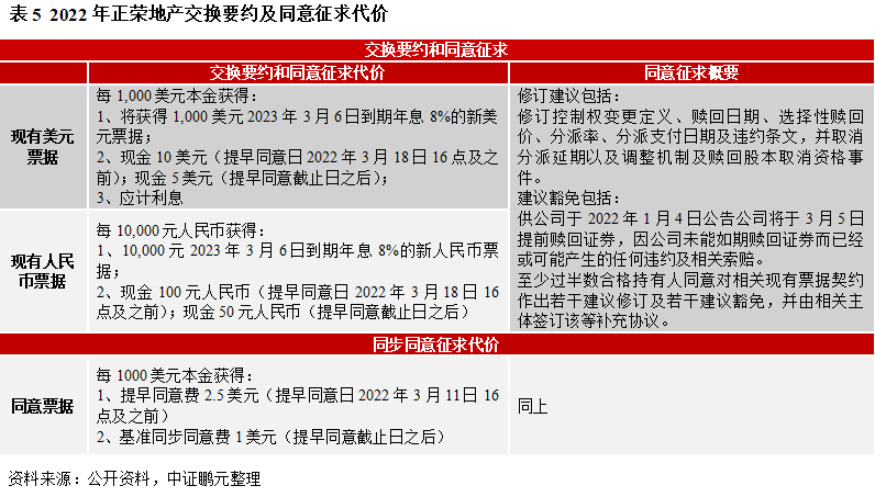 2022年房地產市場仍然面臨很大壓力,市場未出現大幅回升及多重融資選擇依然偏緊的情況下,正榮地產集團有限公司(簡稱“正榮地產”,6158HK)對其短期流動性仍持謹慎態度。公司預計其現有內部資源可能不足以償還2022年3月到期境外債務,(1)于2022年2月21日對存續多只境外債券發起交換要約和同意征求,包括4只美元票據、1只人民幣票據(分別簡稱“現有美元票據”、“現有人民幣票據”,合并簡稱“現有票據”)。后經多次修改,交換要約和同意征求期限變更為2022年3月4日-3月18日17點(倫敦時間,下同),提早同意截止日由3月4日延期至3月18日16點。(2)2022年2月21日-3月11日17點對8只美元票據(簡稱“同意票據”)進行同步同意征求,其中,提早同意日后續由3月4日延期至3月11日16點。根據公告,2022年3月28日召開持有人會議,審議上述特別議案,即同意征求涉及的修訂及豁免事項。3月29日,待特別決議通過,完成補充文件簽署,支付相關同意費用后,方可執行相關修訂條款。