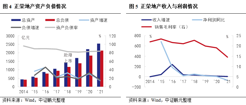 具體來看,2021年正榮地產毛利率大幅下降4.5個百分點至14.6%,聯合投資占比提升,少數股東損益占比提升至32.34%,歸母凈利潤同比下降69%,盈利能力有待提升。受土地新政影響,2021年平均拿地成本同比增長37.3%。截至2021年末,公司土地儲備集中在長江三角洲和海西,占比62%,一二線城市占比82%,項目再投資壓力較大。截至2021年末,正榮地產凈負債率85.5%(前值64.7%),現金短債比約1.1(前值2.2),剔除預收賬款的資產負債率74.9%(前值76.6%),處于黃檔。此外,一年內償還的債務大幅增長76%至344億元,其中,債券約64.94億元,而貨幣資金147億元,非受限現金短債比下降至0.43,未來償債壓力加大。
