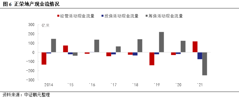 借助債務融資,正榮地產2016年來迅速擴張,2018年赴港上市成功,同年步入銷售額千億房企。2019年,惠譽將公司級別由B上調至B+,穆迪由B2上調至B1,2021年6月惠譽繼續上調展望至正面。正榮地產的債券融資以境外市場為主,境內市場以資產支持證券為主要品種,發行日集中在2020年,到期日集中在2021年和2023年。高度依賴外部融資的“高杠桿、高周轉”模式,在2021年下半年被迫結束。2021年,正榮地產籌資活動現金流由正大幅轉負,境內債券融資腰斬,境外債券融資抓住上半年窗口期,此后融資也開始減少。隨著債務陸續到期,2021-2023年償還壓力大幅攀升,外部融資高度敏感,2021年公司加大回購債券力度,分多次累計回購約0.65億美元債券,提振市場信心。2022年伊始,三大評級機構相繼下調公司發行人級別。
