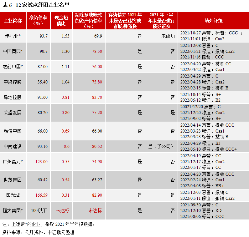 從目前企業所處困境和政策支持來看,12家重點紓困企業是進行債券置換和同意征求的合適對象。一方面,是企業有金融機構的資金支持,可以較快緩解短期流動性壓力,另一方面,上述企業2021年合約銷售額均在1,000億元以上,集中在全國前三十,業務以長三角為主,土儲質量較高,未來項目去化環境較好。一定程度的外部支持,可以極大推動企業債務風險化解,降低交換風險。截至2022年5月14日,12家房企中6家未公布2021年年報,其中,融信中國和廣州富力因更換會計師而延期披露。根據各家公司最新數據(上述6家采用2021年半年報),其中陽光城和廣州富力為紅擋。目前,除綠地控股、融信中國和中南建設外,其余企業在2021年來均出現了美元債違約、展期或置換。具體來看,除凈負債率外,另外兩個指標多未達標,尤其是現金短債比。短債上升、現金減少,使得該指標惡化。即使現金短債比達標,但集團內部或存在資金使用不規范的問題,限制比例升高,都會造成償債資金缺口。