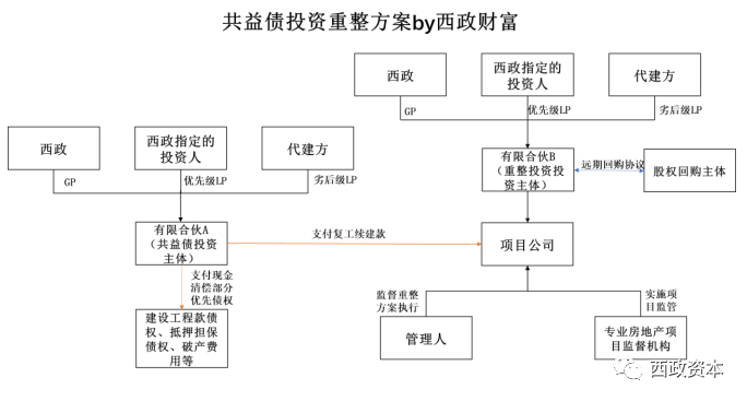 需要注意的是,以上投資架構(gòu)的設(shè)置只能在項(xiàng)目公司股權(quán)可釋放出來的情況下才能適用(也即解除質(zhì)押、查封并具備轉(zhuǎn)股條件),而事實(shí)上困境房企或破產(chǎn)房企項(xiàng)目公司的股權(quán)基本都無法滿足這一條件,因此我們?cè)谌谫Y操作層面更多的是以共益?zhèn)鶛?quán)的投資為主,以下就我們目前的業(yè)務(wù)操作案例做簡(jiǎn)要介紹和說明(具體見下述產(chǎn)品架構(gòu)):