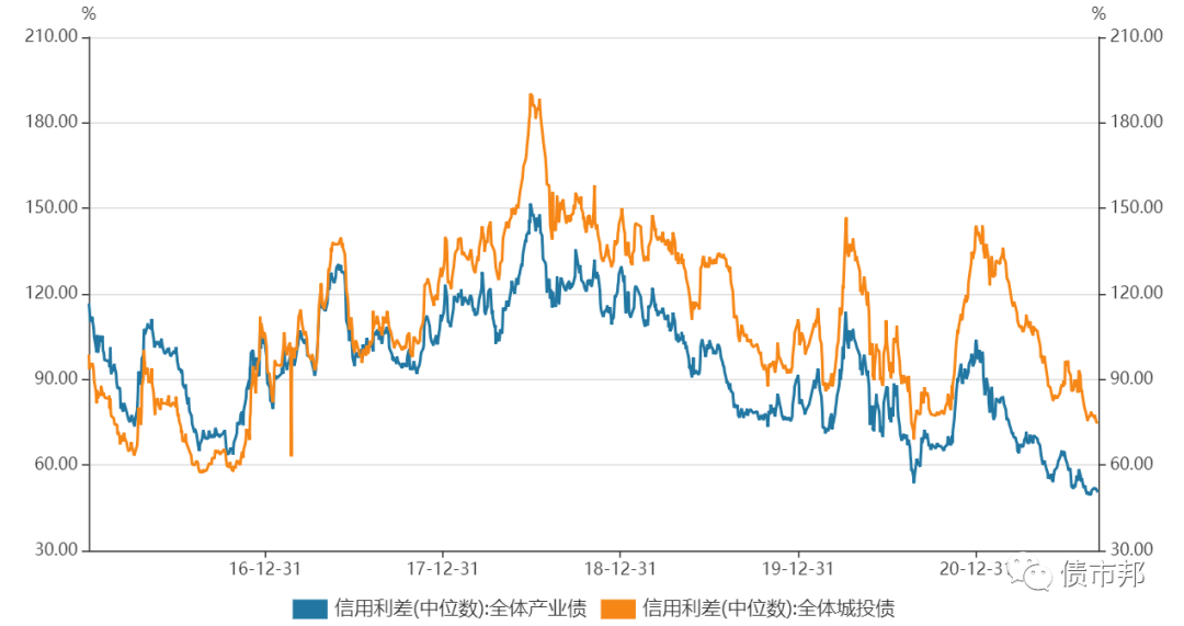 信用利差也在買買買的聲浪中被壓縮到極致,城投債利差來到了近年來的一個(gè)低點(diǎn)區(qū)域,產(chǎn)業(yè)債的利差更是打破了2016年資產(chǎn)荒時(shí)候的最低記錄。