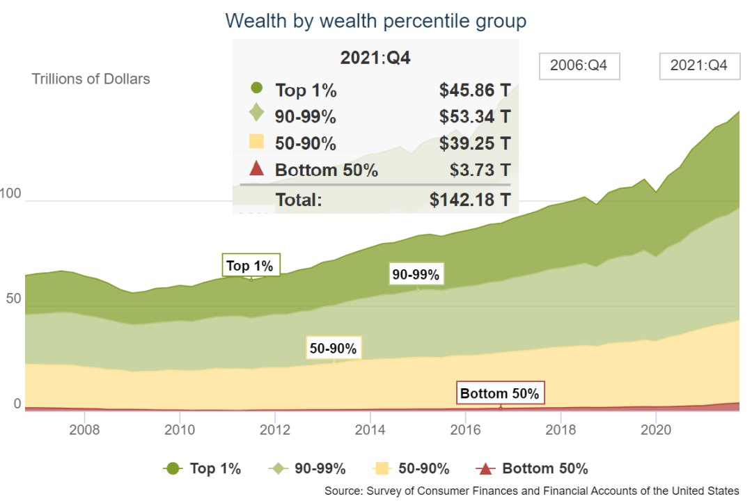 根據美聯儲發布的美國2021年第四季度家庭財富分布情況: