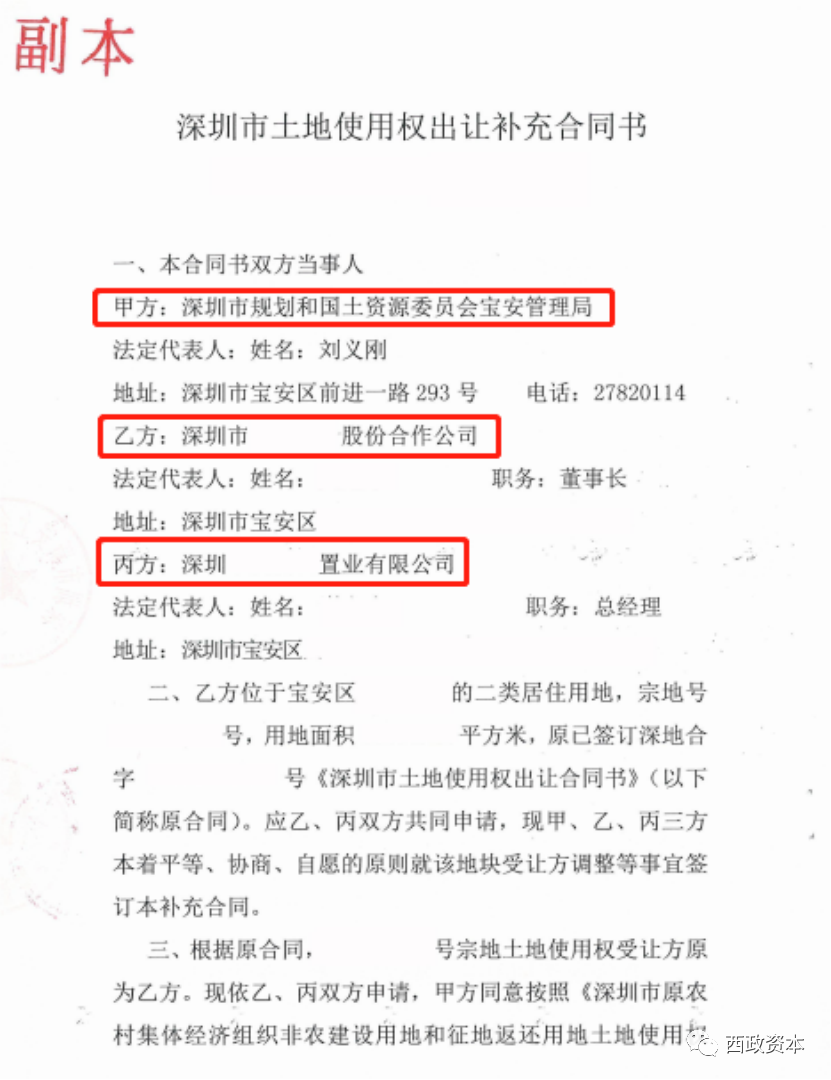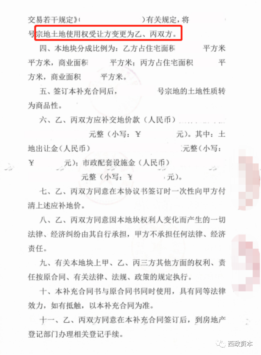 土地整備利益統(tǒng)籌項目的村股份公司留用地合作開發(fā)在雙抬頭的模式下,亦涉及將原屬于村股份公司的留用地變更至村股份公司和開發(fā)商雙方名下的操作,也即由雙方共同持有土地使用權(quán)。目前實務(wù)操作一般是規(guī)劃和自然資源部門先跟村股份公司簽訂《土地出讓合同》(村股份公司為受讓人),然后由規(guī)劃和自然資源部門、村股份公司及開發(fā)商三方再簽訂《土地出讓合同補(bǔ)充協(xié)議》,將土地使用權(quán)的受讓人變更為村股份公司和開發(fā)商兩方,由雙方共同持有留用地土地使用權(quán),也即土地證辦理完成后權(quán)屬人是雙主體。具體項目報批報建時,由開發(fā)商和村股份公司一起作為雙主體進(jìn)行申報,所有對政府的手續(xù)和文件都需要雙方蓋章,包括預(yù)售合同也都是雙方蓋章,當(dāng)然,為避免操作上的繁瑣問題,常見的做法是在預(yù)售前村股份公司出具經(jīng)公證的委托書,全權(quán)委托開發(fā)商辦理所有后續(xù)手續(xù)和預(yù)售、物業(yè)管理聘請等事宜。物業(yè)分配時,村股份公司和開發(fā)商再按照土地出讓合同和補(bǔ)充協(xié)議約定的分配比例分配物業(yè),下圖為利益統(tǒng)籌項目留用地《土地出讓合同補(bǔ)充協(xié)議》的示例。