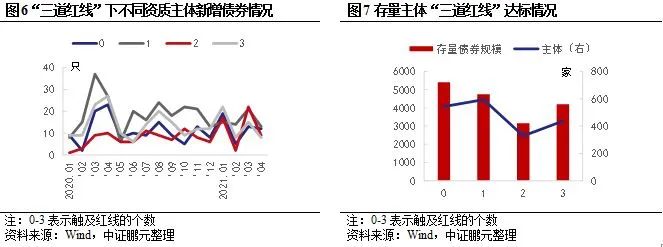 “三道紅線”對不同主體發行新的債券產生一定影響,從圖6看,觸及3條紅線[3]的企業再融資數量僅次于觸及1條紅線的企業,但進入2021年來,該類企業新增債券數量出現下降。在存量債券發行主體1902個樣本中,觸及1條紅線的企業占比31.23%,觸及2條紅線的企業占比17.25%,觸及3條紅線的企業占比22.98%,其中,協信遠創觸及3條紅線。從存量債券規模看,觸及3條紅線的企業存量債券規模也較大。從指標看,凈負債率未達標的企業數量最多,占比63%,凈負債率和現金短債比未達標企業占比分別為53%和50%。整體看,地產新政策對企業再融資的壓力不容忽視,尤其是財務表現較差的企業,需要關注其債券以外的再融資渠道。對于資產受限程度高,銷售情況不理想的企業,風險或逐步暴露。
