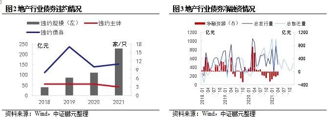 截至2021年3月末,出現信用風險的房地產企業共計12家,違約債券46只,違約規模約466億元。截至4月21日,已違約的地產主體存續的未違約債券規模約260億元。從凈融資情況看,地產行業2019年來的凈融資明顯回落,但到期壓力從2020年開始明顯增長,3月和4月在寬松市場融資環境中,發行規模大幅增長,一定程度上緩解了資金壓力。但受新冠疫情影響,企業收入的恢復有所滯后。受行業政策持續收緊影響,2020年8月以來,地產行業凈融資持續為負,后續償債壓力依然很大。