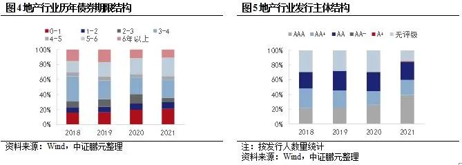 從新增債券特征看,地產行業債券期限短期化趨勢明顯,3年期以下品種占比從2018年31%升至2020年的41%。發行主體結構在2020年之前波動不大,但2021年來高等級主體占比明顯提升,無評級主體占比下降,這與“三道紅線”[2]的新政有關系。
