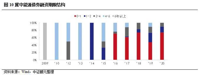 冀中能源的風險主要是債務結構不合理。第一,外部融資以借款為主,且流動負債占比超過60%。債券融資規模從2018年出現明顯增長,而償還高分期就出現在2019年和2020年,說明融資期限以短期為主,從圖10中可以明顯看出1年期以下債券占比超過50%,2020年新增債券期限在3年以下,若考慮回售日,則償還壓力或提前至2022年。第二,少數股東權益占比高,母公司層面負債率高企,且常年虧損。資產負債率常年維持在90%以上,流動負債占比增長迅速,從2017年的47%增長至2020年三季度末的73%,而利潤常年為負。第三,受永煤控股違約影響,公司再融資受限,2020年5月以來公司未新增債券。整體看,債務集中到期,加上可用現金不足,應付預付款項占比高,資產變現能力較弱,疊加新冠疫情影響,冀中能源的償付壓力凸顯。