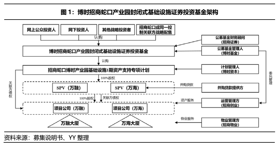 目前,我國公募基礎(chǔ)設(shè)施REITs采用公募基金+資產(chǎn)支持證券的架構(gòu)。以博時招商蛇口產(chǎn)業(yè)園封閉式基礎(chǔ)設(shè)施證券投資基金架構(gòu)(已受理)為例,從下往上看,需要先有項目公司(即裝存底層資產(chǎn)),然后向上由特殊目的公司(SPV)去持有項目公司的權(quán)益,并且以該收益權(quán)為底層資產(chǎn)來發(fā)行資產(chǎn)支持證券,之后頂部由公募基金去持有這些ABS。最后一層結(jié)構(gòu)是,投資人通過購買公募基金的份額來享有底層資產(chǎn)的收益權(quán),以此完成資產(chǎn)收益從項目公司向投資人的層層傳導(dǎo)。