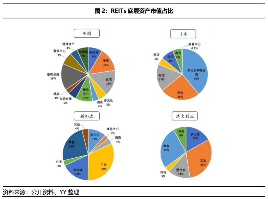 境外成熟的REITs市場,大多始于商業(yè)地產(chǎn),且成為各國REITs的主流業(yè)態(tài)。從下圖可以看出,美國、日本、新加坡和澳大利亞等國家中,住宅、零售、辦公、酒店等商業(yè)地產(chǎn)REITs的市值占比幾近半數(shù)。