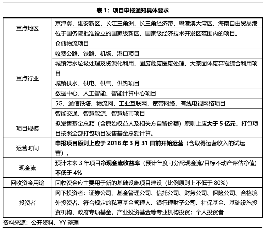 2020年8月3號發(fā)布的《關(guān)于試點項目申報通知》(下稱“通知”)明確,優(yōu)先支持基礎(chǔ)設(shè)施補短板行業(yè),鼓勵(鼓勵是三大方面)信息網(wǎng)絡(luò)等新型基礎(chǔ)設(shè)施,以及國家戰(zhàn)略性新興產(chǎn)業(yè)集群、高科技產(chǎn)業(yè)園區(qū)、特色產(chǎn)業(yè)園區(qū)等開展試點,并在項目規(guī)模、運營時間、現(xiàn)金流、回收資金用途等方面做出了具體的規(guī)定,見下表。