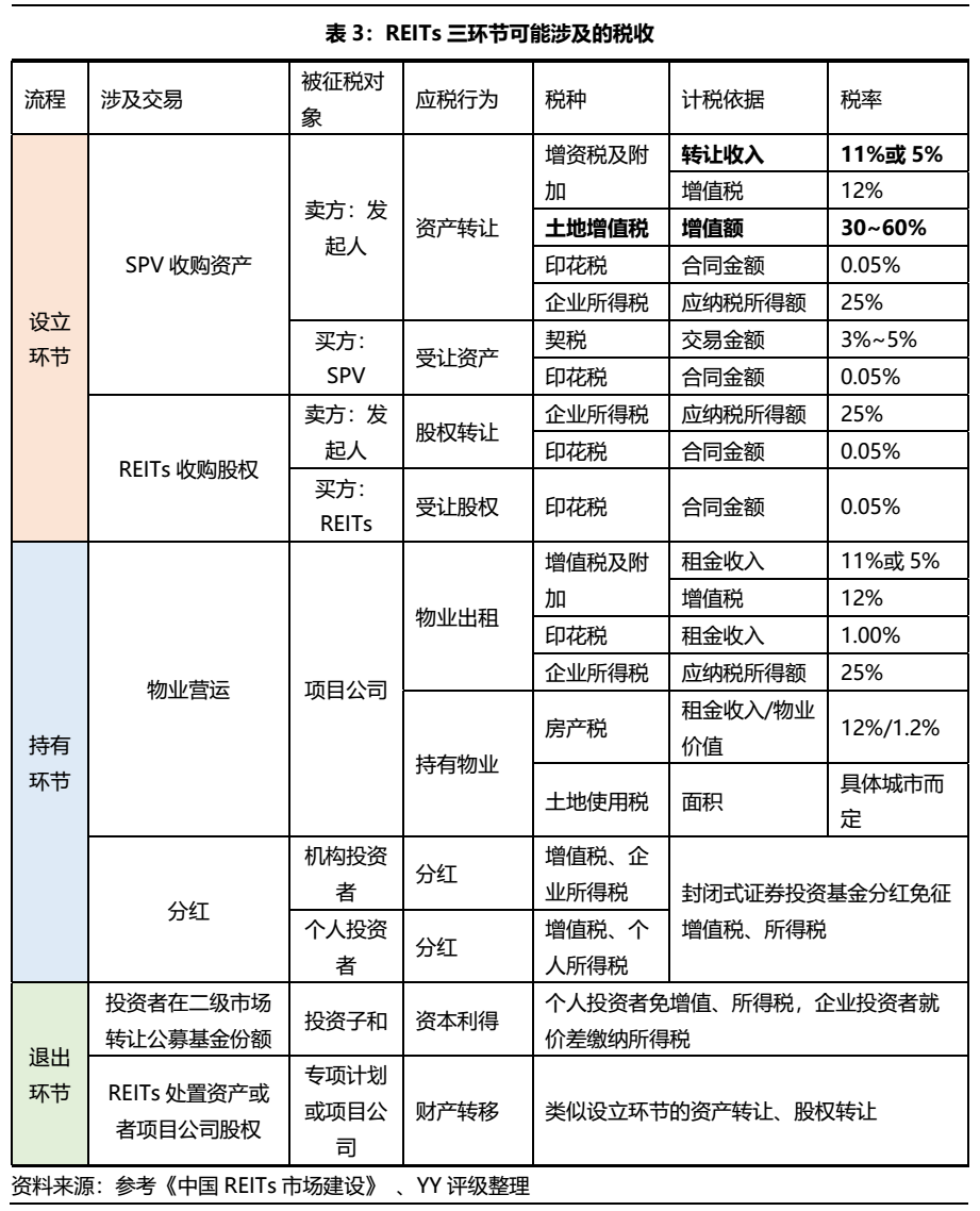①稅負(fù)重。在REITs設(shè)立階段,若采用SPV收購資產(chǎn)的方式,在資產(chǎn)轉(zhuǎn)讓中會就產(chǎn)生土地增值稅,而增值部分的征收比例在30~60%之間,是稅負(fù)最重的一種潛在稅收,在退出階段亦是如此,高稅負(fù)會降低持有人的發(fā)行意愿和REITs產(chǎn)品的收益率。