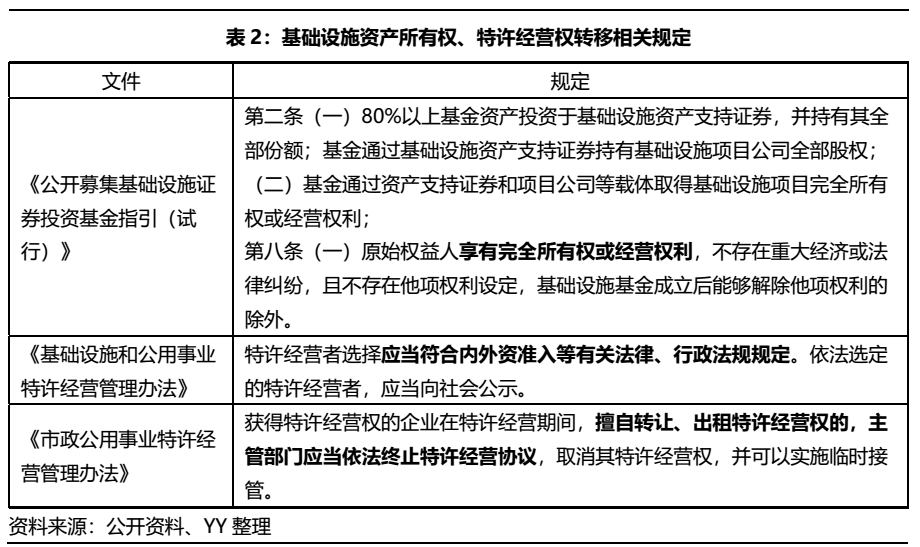 而對于基礎(chǔ)資產(chǎn)所有權(quán)和經(jīng)營權(quán)的規(guī)定,主要矛盾點在于業(yè)內(nèi)對于基建領(lǐng)域中特許經(jīng)營的內(nèi)涵和外延尚未達(dá)成共識,在目前相關(guān)部委發(fā)布的特許經(jīng)營協(xié)議示范文本及很多法規(guī),如上表的國家發(fā)改委、財政部等六部委2015年聯(lián)合頒布的《基礎(chǔ)設(shè)施和公用事業(yè)特許經(jīng)營管理辦法》以及住建部頒布的《市政公用事業(yè)特許經(jīng)營管理辦法》中,都存在限制通過股權(quán)轉(zhuǎn)讓實現(xiàn)經(jīng)營權(quán)轉(zhuǎn)讓的條款或規(guī)定。