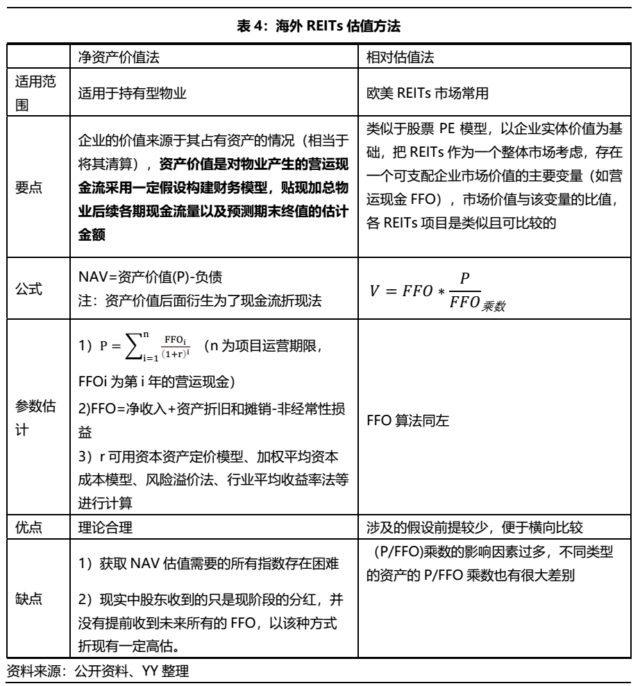 目前海外市場對REITs的估值主要有兩種方法:絕對估值法(凈資產(chǎn)法,又叫NAV法)和相對估值法(P/FFO乘數(shù)法),NAV法主要適用于持有型物業(yè),P/FFO在歐美市場上較為常用,具體要點如下。