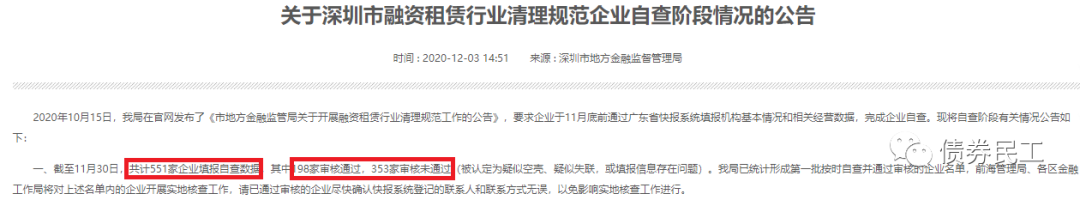 先來看一組數據。深圳市地方金融監督管理局12月3日披露《關于深圳市融資租賃行業清理規范企業自查階段情況的公告》,公告中指出:截至11月30日,共計551家企業填報自查數據,其中198家審核通過,占比為35.93%;353家審核未通過(被認定為疑似空殼、疑似失聯,或填報信息存在問題),占比約為64.07%。雖然融資租賃行空殼、失聯的現象一直都是比較嚴重,但是這次深圳官方統計的這個數據,也在一定程度上反映了融資租賃行業的艱難。