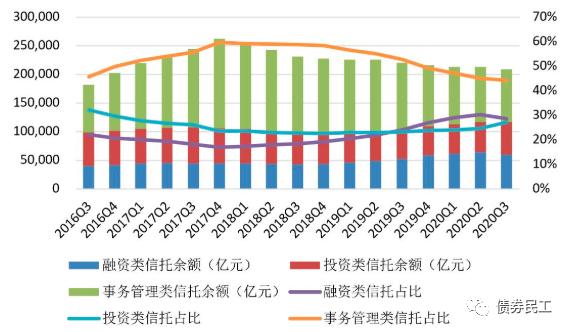 而如果是根據信托功能分類看,2020年3季度的融資類信托減少了4,966.43億元,信托的融資類功能進一步被削弱。