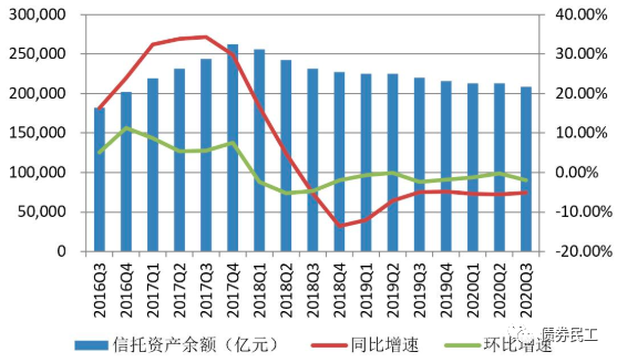 根據中國信托業協會的官方數據,截至2020年3季度末,信托業受托管理的信托資產余額為20.86萬億元,較年初減少7,432.79億元,同比下降5.16%;信托資產余額較2季度末減少4,182.31億元,環比下降1.97%。國內的信托資產規模已經是連續第11個季度下降。
